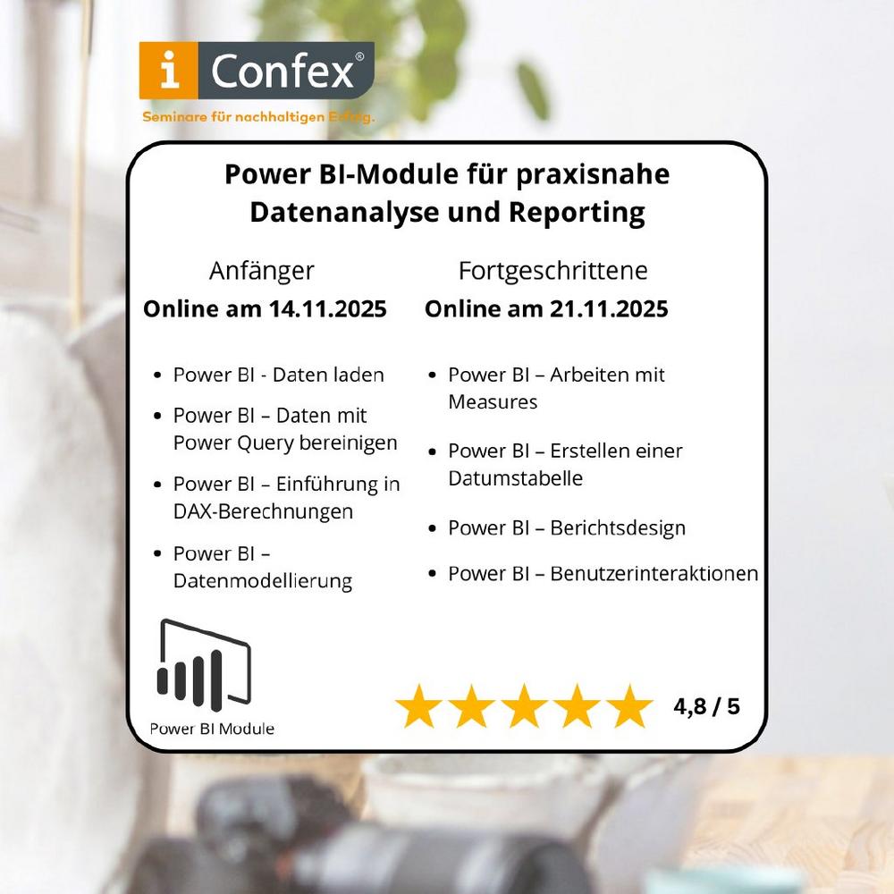 Die Confex Training GmbH zählt seit über 15 Jahren zu den führenden Anbietern für Excel- und Power BI-Seminare in Deutschland. Wir bieten praxisorientierte Schulungen, die Fachwissen gezielt mit dem Berufsalltag verbinden. Unsere Trainer*innen sind didaktisch geschult und sorgen für nachhaltiges Lernen in einer professionellen Seminarumgebung. Von der persönlichen Betreuung bis zum durchdachten Veranstaltungsablauf steht der Lernerfolg im Mittelpunkt. Unsere hohe Weiterempfehlungsquote zeigt: Weiterbildung bei Confex wirkt.