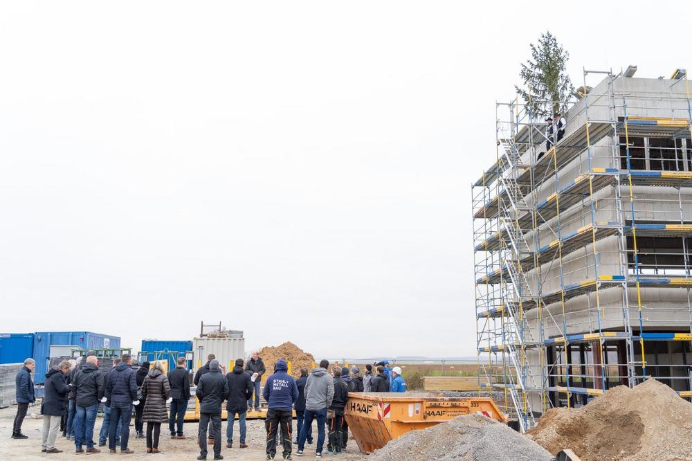 Im Richtfest Feiern bekommt das Kunststoff-Zentrum SKZ allmählich Routine. Nach der Modellfabrik Anfang Juli war am 26. November nun ein weiteres Gebäude an der Reihe: das Trainingszentrum Qualitätswesen (TZQ). „Ich freue mich, dass das, was eins noch in den Köpfen steckte, jetzt vor uns steht“, sagte SKZ-Geschäftsführer Dr. Thomas Hochrein bei der Begrüßung. Während die Modellfabrik auf eine Vision von SKZ-Institutsdirektor Prof. Dr.-Ing. Martin Bastian zurückgehe, sei das TZQ seine Idee gewesen. „Das finde ich persönlich sehr schön“, so Hochrein gut gelaunt. Spatenstich des TZQ war im Februar.