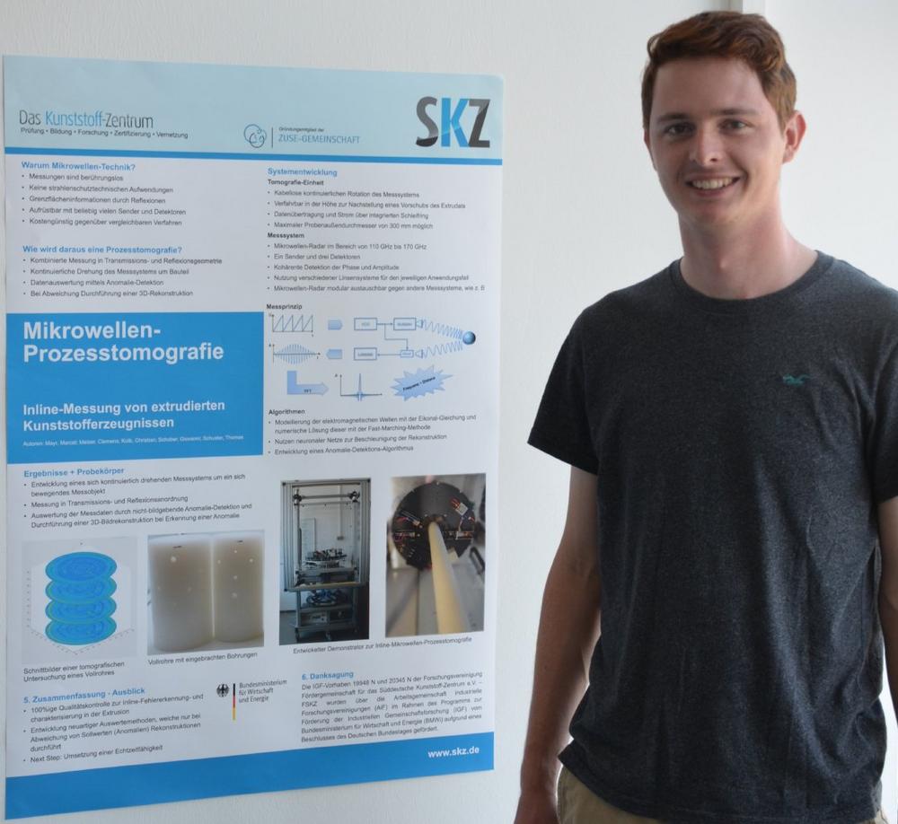 Das Radar rotiert dabei um das zu prüfende Extrudat, sodass im Zusammenspiel mit der Liniengeschwindigkeit des Extrudats eine dreidimensionale 100-prozentige Kontrolle erreicht wird. Durch eine intelligente Echtzeit-Signalverarbeitung der Messdaten konnten so Informationen über die geometrischen Abmaße und von außen nicht sichtbaren Fehlstellen im Bauteilinneren gewonnen werden. Mit diesem System kann zukünftig die Produktqualität inline bewertet und verbessert werden. Ein weiterer Vorteil: Reklamationen können reduziert und somit eine wirtschaftlichere und effizientere Produktion erreicht werden. „Ich freue mich total über die Anerkennung des VMPA. Dill hat mit seiner Arbeit einen wichtigen Beitrag für die Mikrowellen-Tomografie geliefert, was nun auch verdient honoriert wurde“, sagt Marcel Mayr, wissenschaftlicher Mitarbeiter am SKZ und Betreuer von Gerhard Dill.